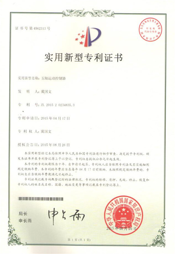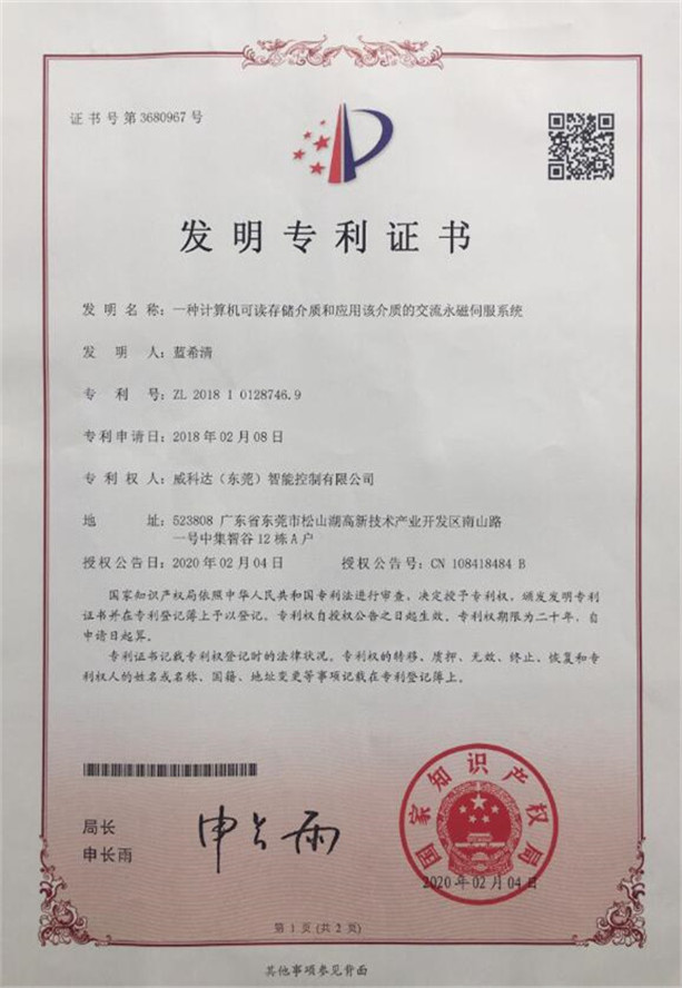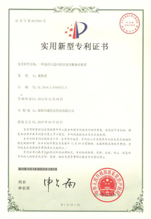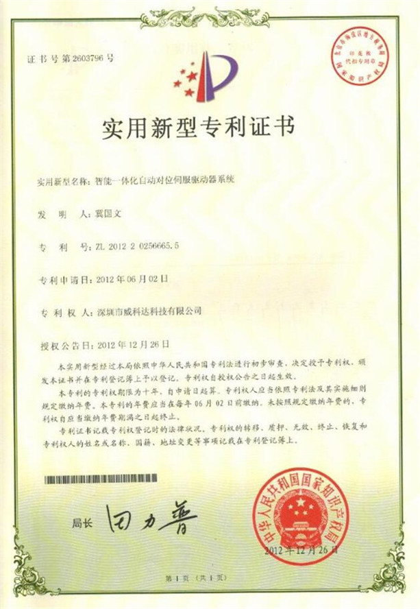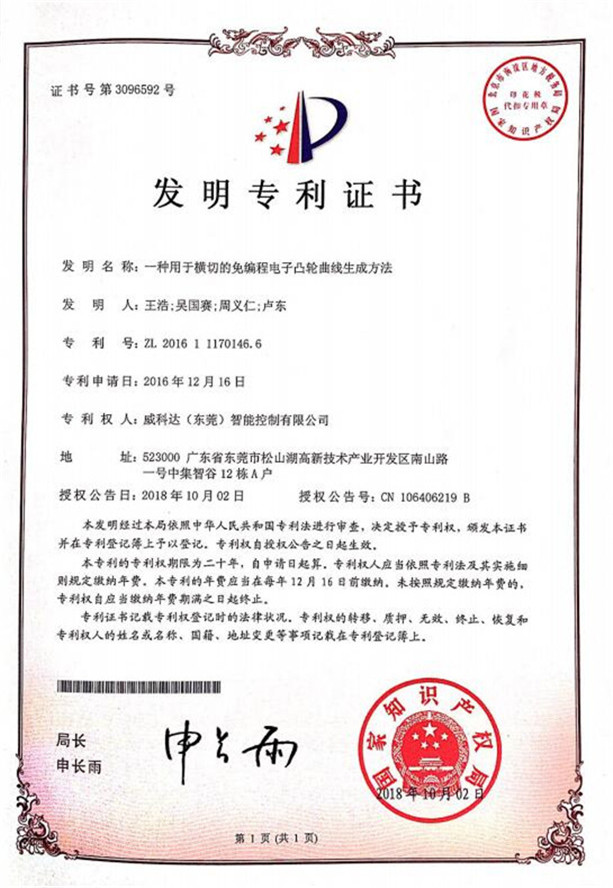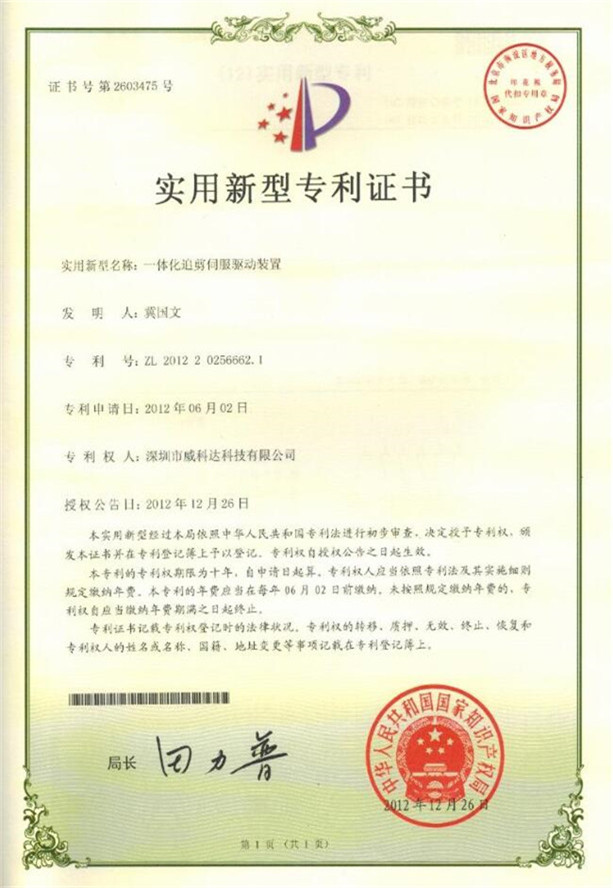 鏈刀伺服驅(qū)動裝置專利證書